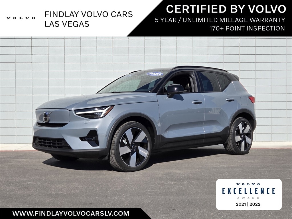 Findlay Volvo Cars Las Vegas proudly offers this Volvo XC40 Recharge Pure Electric with 22362 miles. Thunder Gray Metallic over Charcoal, this XC40 Recharge Pure Electric was ordered with highly desirable factory features like: Internet access capable: Digital Services Package w/ 4 Year Subscription, Navigation System, 13 Speakers, 4-Wheel Disc Brakes, ABS brakes, Air Conditioning, Alloy wheels, Apple CarPlay, Audio memory, Auto High-beam Headlights, Auto-dimming door mirrors, Auto-dimming Rear-View mirror, Automatic temperature control, Brake assist, Bumpers: body-color, Connect Suede Textile/Microtech Upholstery, Delay-off headlights, Driver door bin, Driver vanity mirror, Dual front impact airbags, Dual front side impact airbags, Electronic Stability Control, Emergency communication system, Exterior Parking Camera Rear, Four wheel independent suspension, Front anti-roll bar, Front Bucket Seats, Front Center Armrest, Front dual zone A/C, Front fog lights, Front reading lights, Fully automatic headlights, Garage door transmitter: HomeLink, harman/kardon® Speakers, Headlight cleaning, Heated door mirrors, Heated Front Seats, Heated front seats, Heated rear seats, Heated steering wheel, HVAC memory, Illuminated entry, Knee airbag, Leather Shift Knob, Low tire pressure warning, Memory seat, Occupant sensing airbag, Outside temperature display, Overhead airbag, Overhead console, Panic alarm, Passenger door bin, Passenger vanity mirror, Pixel Technology Headlights, Power door mirrors, Power driver seat, Power Liftgate, Power moonroof, Power passenger seat, Power steering, Power windows, Radio data system, Radio: harman/kardon Premium Audio System, Rain sensing wipers, Rear anti-roll bar, Rear fog lights, Rear reading lights, Rear seat center armrest, Rear window defroster, Rear window wiper, Remote keyless entry, Security system, Speed control, Speed-sensing steering, Split folding rear seat, Spoiler, Steering wheel mounted audio controls, Telescoping steering wheel, Tilt steering wheel, Traction control, Trip computer, Turn signal indicator mirrors, Variably intermittent wipers, and Wheels: 20" 5-V Spoke Matte Graphite Diamond Cut Alloy.
