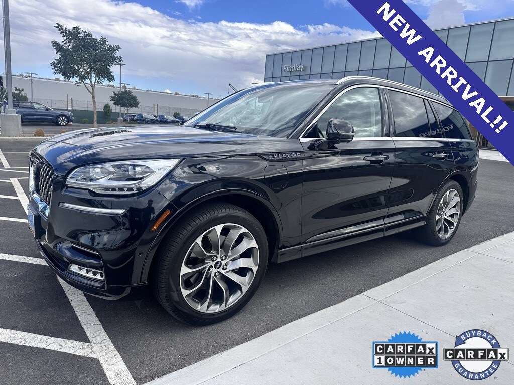 Findlay Volvo Cars Las Vegas proudly offers this Lincoln Aviator Plug-In Hybrid with 42802 miles. Infinite Black Metallic Clearcoat over Sandstone, this Aviator Plug-In Hybrid was ordered with highly desirable factory features like: Dynamic Handling Package (Adaptive Suspension w/Road Preview and Air Glide Suspension w/Dynamic Lower Entry), Elements Package Plus, Equipment Group 301A (Head-Up Display and Phone As A Key), Illumination Package, Lincoln Co-Pilot360 1.5 Plus, Luxury Package (30-Way Perfect Position Seats w/Active Motion, Radio: Revel Ultima 3D Audio System w/28 Speakers, and Rear Door Sunshades), Active Cruise Control, 14 Speakers, 3.31 Axle Ratio, 3rd row seats: split-bench, 4-Wheel Disc Brakes, ABS brakes, Adaptive suspension, Air Conditioning, Alloy wheels, AM/FM radio: SiriusXM, Audio memory, Auto High-beam Headlights, Auto-dimming door mirrors, Auto-dimming Rear-View mirror, Automatic temperature control, Brake assist, Bumpers: body-color, Compass, Delay-off headlights, Driver door bin, Driver vanity mirror, Dual front impact airbags, Dual front side impact airbags, Electronic Stability Control, Emergency communication system, Four wheel independent suspension, Front anti-roll bar, Front Bucket Seats, Front Center Armrest, Front dual zone A/C, Front fog lights, Front reading lights, Fully automatic headlights, Garage door transmitter, Heated door mirrors, Heated front seats, HVAC memory, Illuminated entry, Knee airbag, Leather steering wheel, Low tire pressure warning, Memory seat, Navigation System, Occupant sensing airbag, Outside temperature display, Overhead airbag, Overhead console, Panic alarm, Passenger door bin, Passenger vanity mirror, Power door mirrors, Power driver seat, Power Liftgate, Power moonroof: Panoramic Vista Roof, Power passenger seat, Power steering, Power windows, Premium Lthr Heated/Ventilated Fnt Captain's Chairs, Radio data system, Radio: Revel AM/FM Audio System w/14 Speakers, Rain sensing wipers, Rear air conditioning, Rear anti-roll bar, Rear audio controls, Rear dual zone A/C, Rear reading lights, Rear window defroster, Rear window wiper, Remote keyless entry, Security system, SiriusXM Radio, Speed control, Speed-Sensitive Wipers, Split folding rear seat, Spoiler, Steering wheel memory, Steering wheel mounted A/C controls, Steering wheel mounted audio controls, SYNC 3 Communication & Entertainment System, Tachometer, Telescoping steering wheel, Tilt steering wheel, Traction control, Trip computer, Turn signal indicator mirrors, Variably intermittent wipers, and Wheels: 21" Bright-Machined Aluminum.