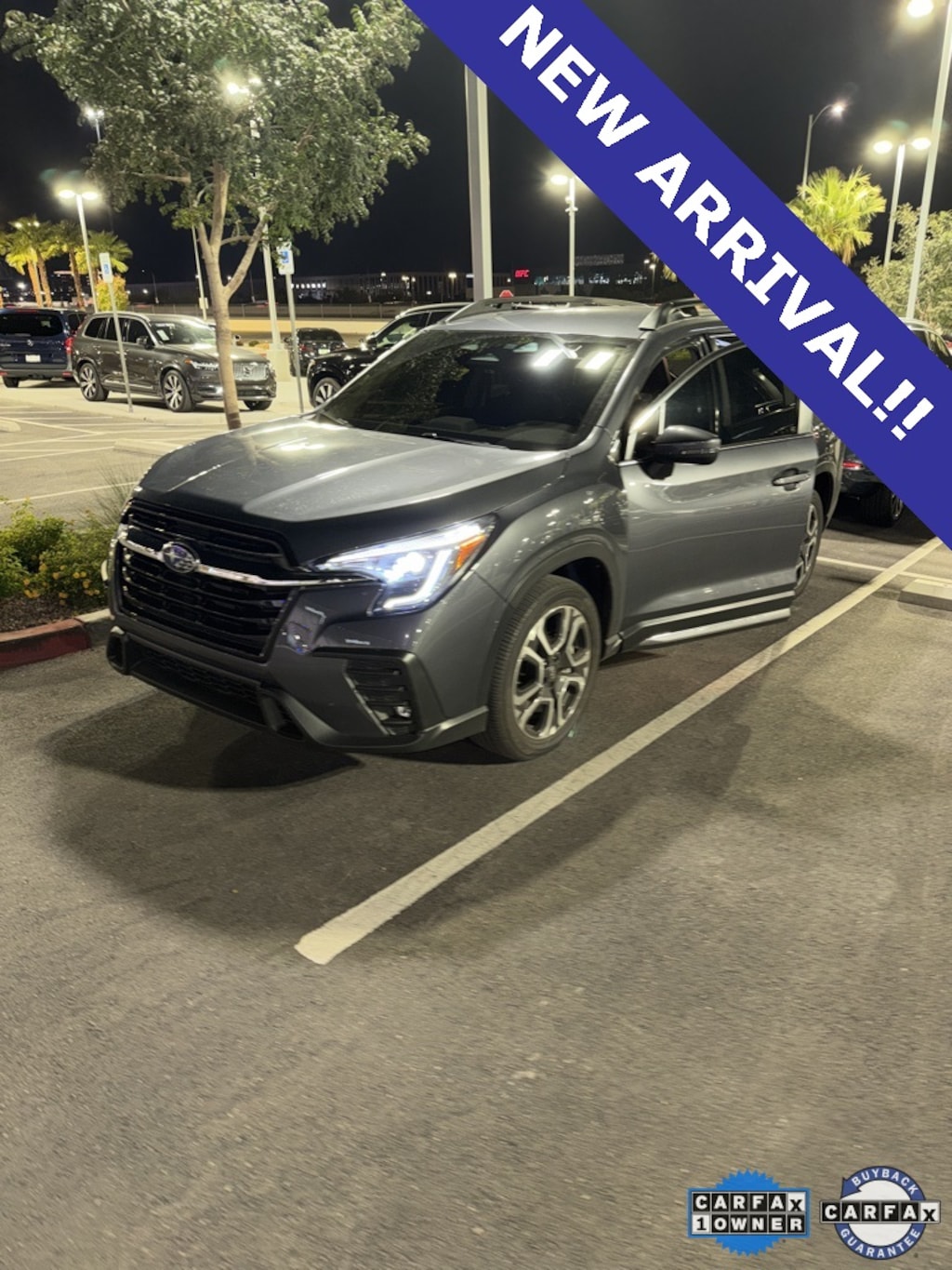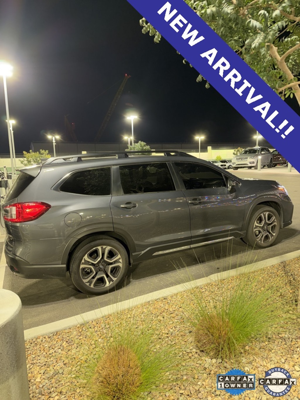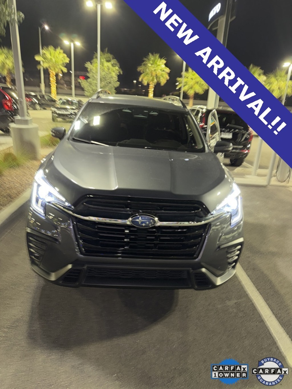 Findlay Volvo Cars Las Vegas proudly offers this Subaru Ascent with 11242 miles. Magnetite Gray Metallic over Slate Black, this Ascent was ordered with highly desirable factory features like: 3rd row seats: bench, 4-Wheel Disc Brakes, 6 Speakers, ABS brakes, Air Conditioning, Alloy wheels, AM/FM radio: SiriusXM, Auto High-beam Headlights, Auto-dimming Rear-View mirror, Automatic temperature control, Axle Ratio: 4.44, Brake assist, Bumpers: body-color, Delay-off headlights, Driver door bin, Driver vanity mirror, Dual front impact airbags, Dual front side impact airbags, Electronic Stability Control, Emergency communication system: STARLINK Safety and Security (Subscription Required), Exterior Parking Camera Rear, Four wheel independent suspension, Front anti-roll bar, Front Bucket Seats, Front Center Armrest, Front dual zone A/C, Front fog lights, Front reading lights, Fully automatic headlights, Garage door transmitter: HomeLink, Heated door mirrors, Heated Front Bucket Seats, Heated front seats, Heated rear seats, Heated steering wheel, HVAC memory, Illuminated entry, Knee airbag, Leather Shift Knob, Leather steering wheel, Low tire pressure warning, Memory seat, Occupant sensing airbag, Outside temperature display, Overhead airbag, Overhead console, Panic alarm, Passenger door bin, Passenger vanity mirror, Perforated Leather-Trimmed Upholstery, Power door mirrors, Power driver seat, Power Liftgate, Power passenger seat, Power steering, Power windows, Radio data system, Radio: Subaru STARLINK 11.6" Multimedia Plus System, Rear air conditioning, Rear anti-roll bar, Rear reading lights, Rear window defroster, Rear window wiper, Reclining 3rd row seat, Remote keyless entry, Security system, Speed control, Speed-sensing steering, Split folding rear seat, Spoiler, STARLINK/Apple CarPlay/Android Auto, Steering wheel mounted audio controls, Tachometer, Telescoping steering wheel, Tilt steering wheel, Traction control, Trip computer, Turn signal indicator mirrors, Variably intermittent wipers, and Wheels: 20" x 7.5 J Dk Gray Alloy w/Machine Finish.